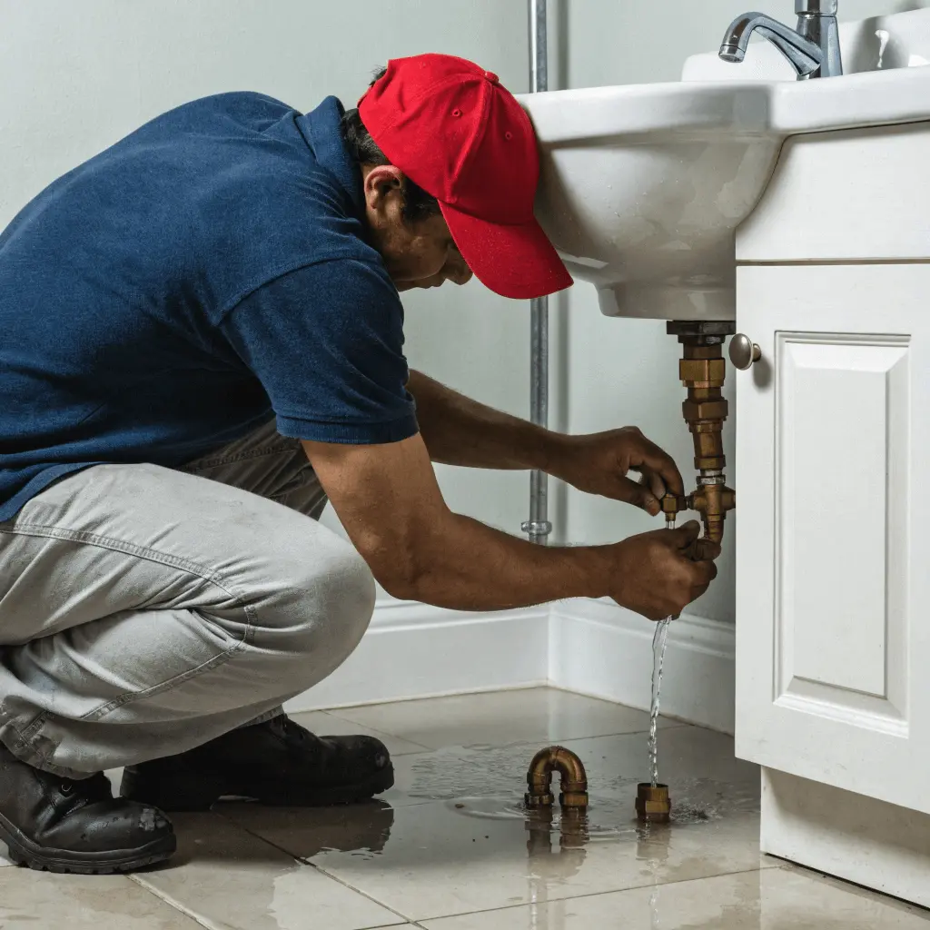 a plumber inspecting a pipe with anchor ties, representing the connection between plumbing maintenance and home safety.